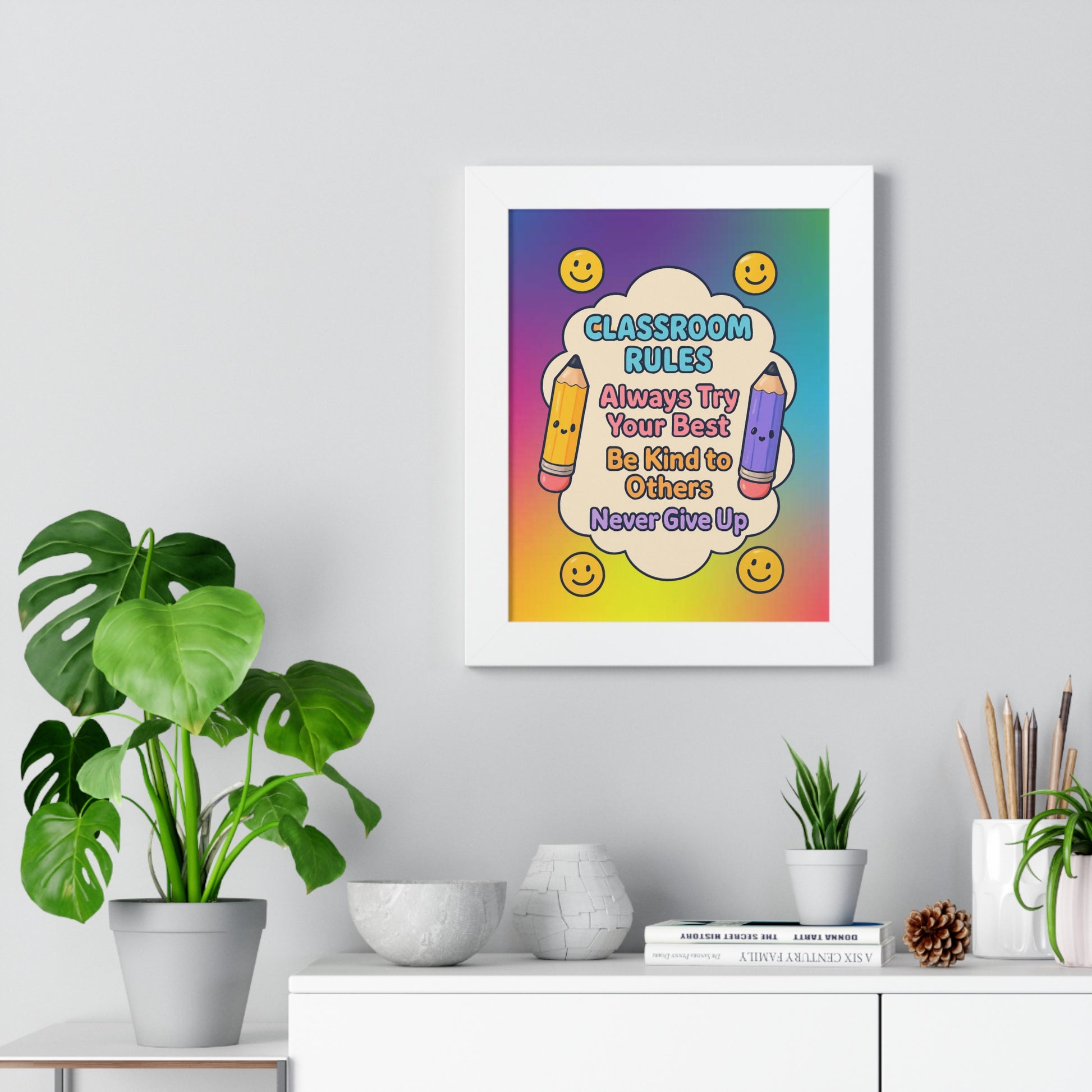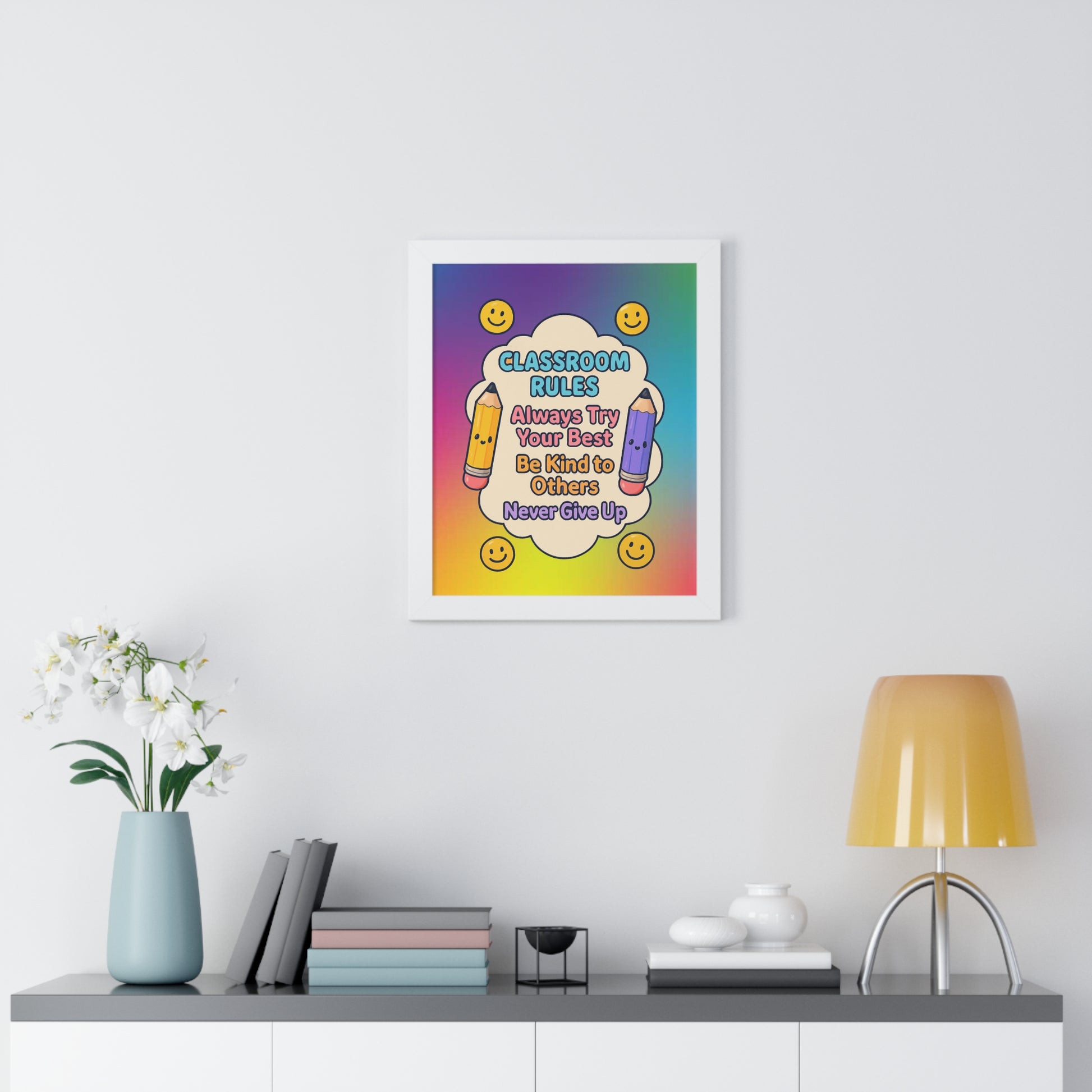 Elevate your space with this vibrant framed vertical poster, perfect for inspiring educators or adorning a classroom. The cheerful design exudes positivity, making it an ideal addition to any learning environment. This eye-catching piece serves as a constant reminder of the joy and dedication that comes with teaching, fostering an uplifting atmosphere wherever it’s displayed. Ideal for teachers, students, or anyone who appreciates the art of education, this poster is a fitting gift for Teacher Appreciation Week, back-to-school celebrations, or end-of-year acknowledgments. With its bright colors and charming message, it also makes a delightful decoration for birthdays and educational milestones.