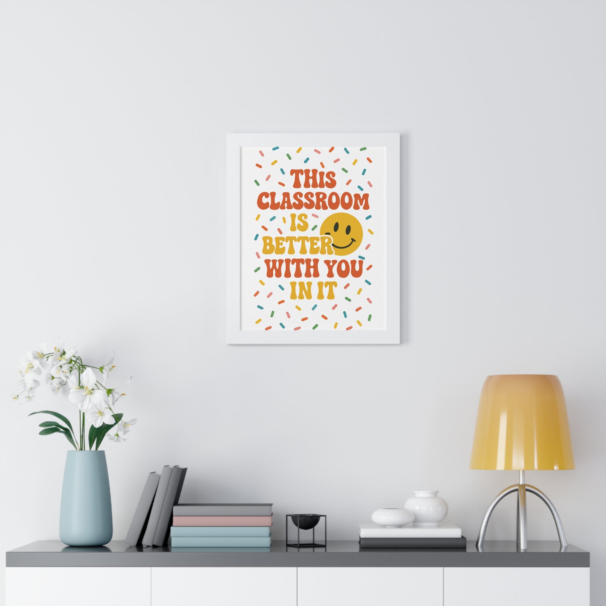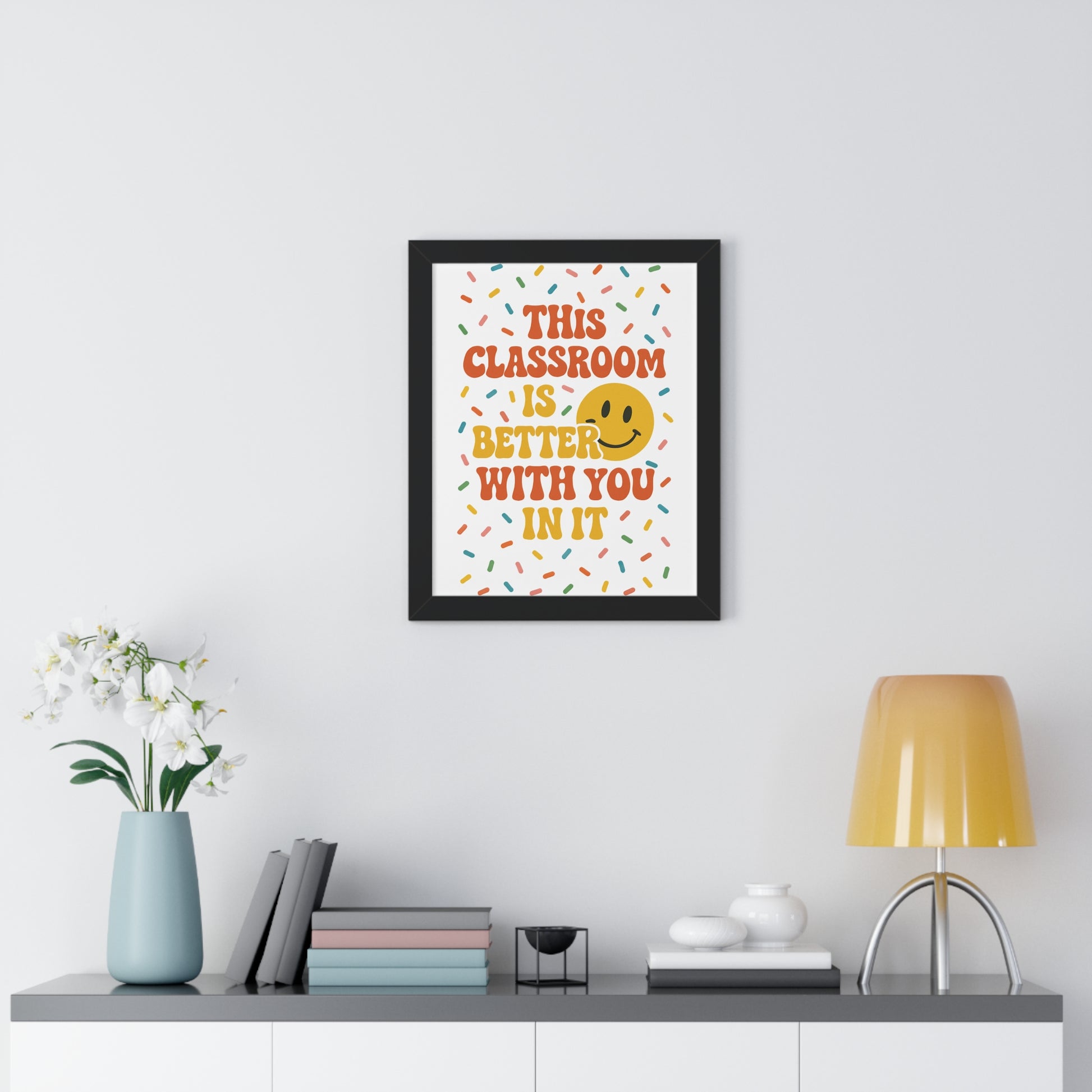 Elevate your space with this vibrant framed vertical poster, perfect for inspiring educators or adorning a classroom. The cheerful design exudes positivity, making it an ideal addition to any learning environment. This eye-catching piece serves as a constant reminder of the joy and dedication that comes with teaching, fostering an uplifting atmosphere wherever it’s displayed. Ideal for teachers, students, or anyone who appreciates the art of education, this poster is a fitting gift for Teacher Appreciation Week, back-to-school celebrations, or end-of-year acknowledgments. With its bright colors and charming message, it also makes a delightful decoration for birthdays and educational milestones.